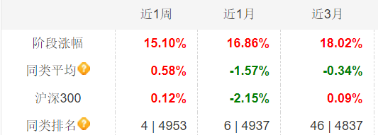 近1月大涨16.86%,同类平均则为负收益,市场排名第6;近1周大涨15.1%,同类平均微涨不足1%,市场排名第4。