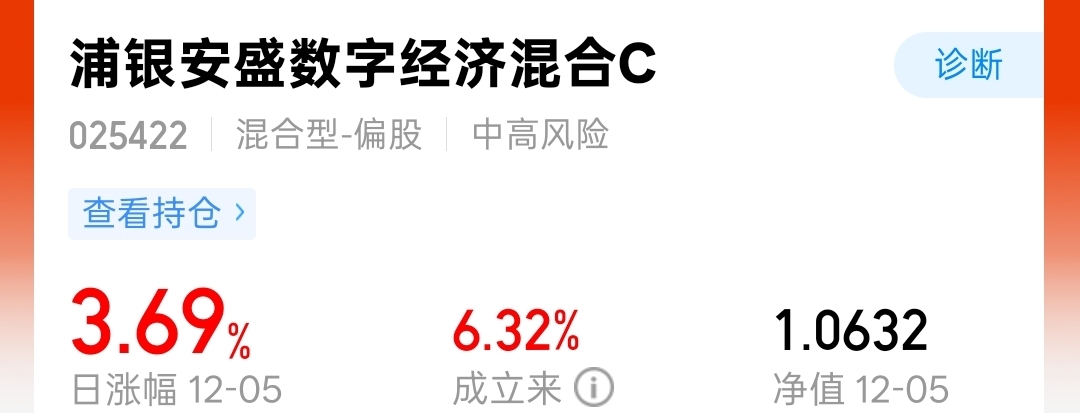 上周上车的$浦银安盛数字经济混合C$ 今天大涨3.69%,进攻性挺强。