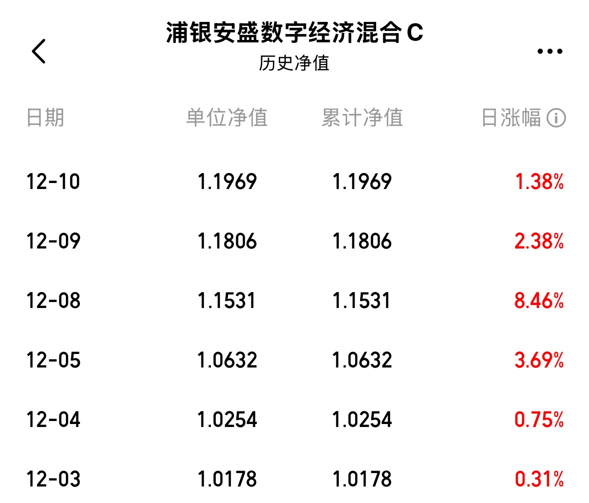 6连涨!有点意思呀,$浦银安盛数字经济混合C$今天再涨1.38%,周一8个多点已