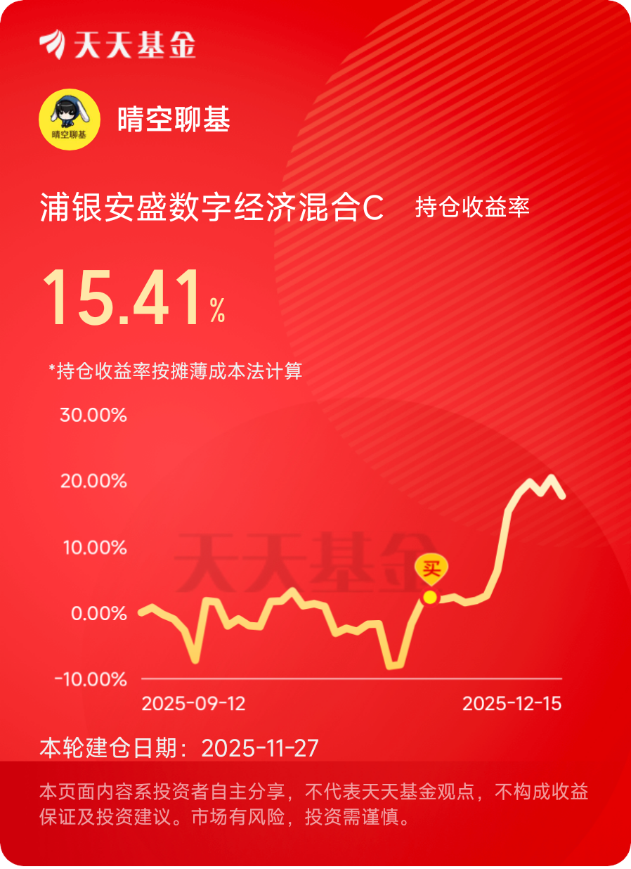 这几天CPO概念波动还是比较大的,这就很考验基金经理的投资功力,好的基金经理能做到能涨抗跌。我对比了下,$浦银安盛数字经济混合C$表现一如既往的稳定,CPO概念指数12月8号涨5.97%,但这只基金同日涨了8.46%;今天(12月15号)CPO概念指数跌了3.06%,该基金跌幅不足2.3%。整体来看,拿着它挺踏实的!#晒收益#