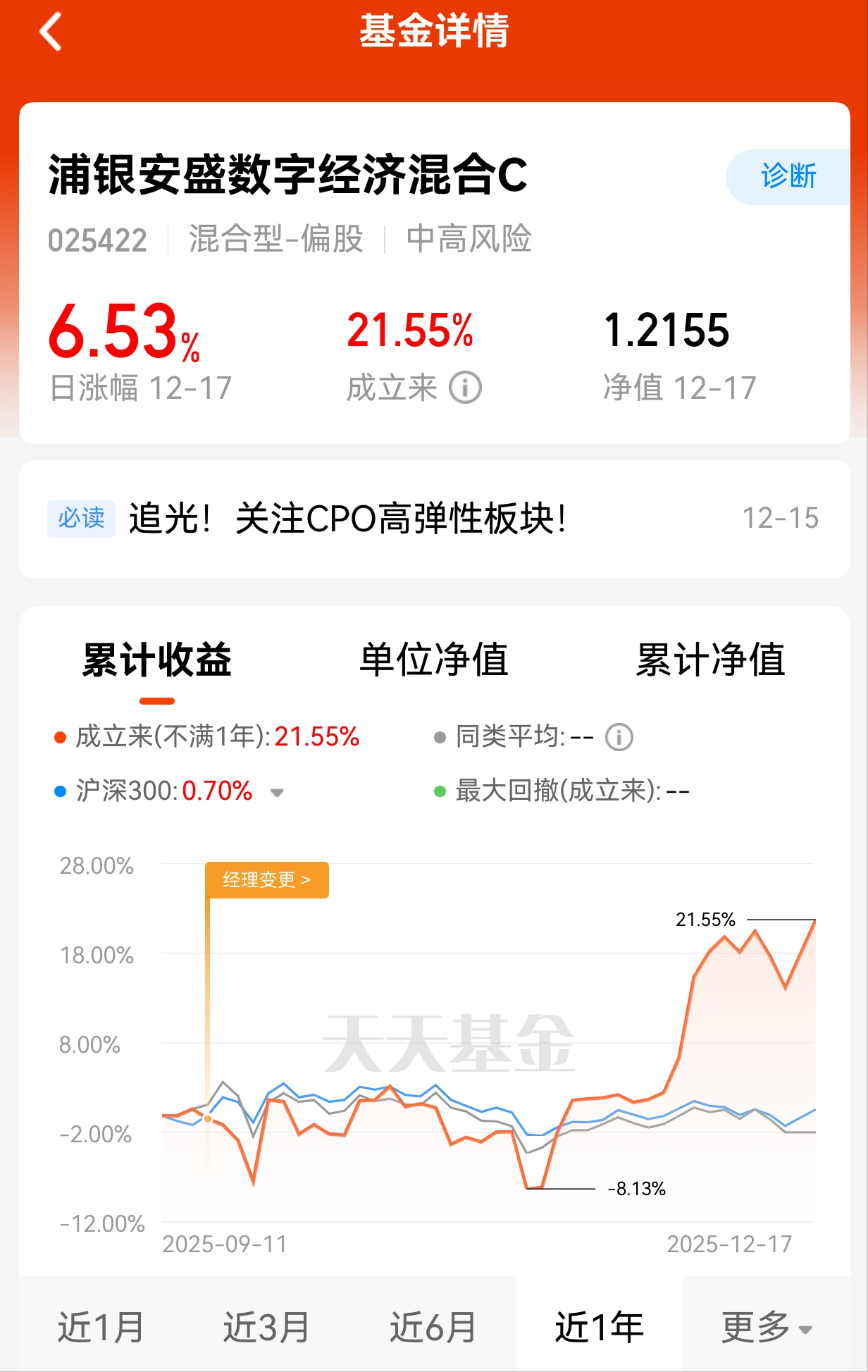 CPO赛道是一个典型的成长型科技赛道,行情主要由产业趋势和业绩驱动。目前全球AI竞赛推动算力基础设施建设,直接拉动了高速光模块(包括采用CPO技术的产品)的需求。海外云巨头已上调2026年1.6T光模块的采购计划。业绩得到验证,板块龙头公司在2025年上半年及三季度的净利润出现数倍增长,强劲的业绩印证了行业高景气度,是板块上涨的重要基础。而且技术迭代从800G向1.6T光模块升级,以及CPO等先进封装技术的渗透率提升,为行业提供了持续的增长动力!作为基民想要参与光模块行情,可通过投资相关个股或聚焦半导体、通信、人工智能等主题基金,弹性表现较好的就是浦银安盛数字经济混合C(025422),还可以看到近期表现,比如最近一周增长了17.18%,最近一月增长了24.24%,如果你正在寻找一只能紧扣时代脉搏、分享数字经济成长红利的基金,那么$浦银安盛数字经济混合C(OTCFUND|025422)$值得你的关注。这只聚焦前沿领域的基金是浦银安盛数字经济混合C(025422)今日表现涨幅是6.53%,算是给关注他的基民们交出了一份不错的成绩单。布局上,继续选择强者恒强的CPO方向布局,浦银安盛跌的少涨的多,是最佳的选择。大盘指数尾盘上涨,随着调整结束,随着本周期指交割结束和日本加息靴子落地,大盘有望展开跨年行情。