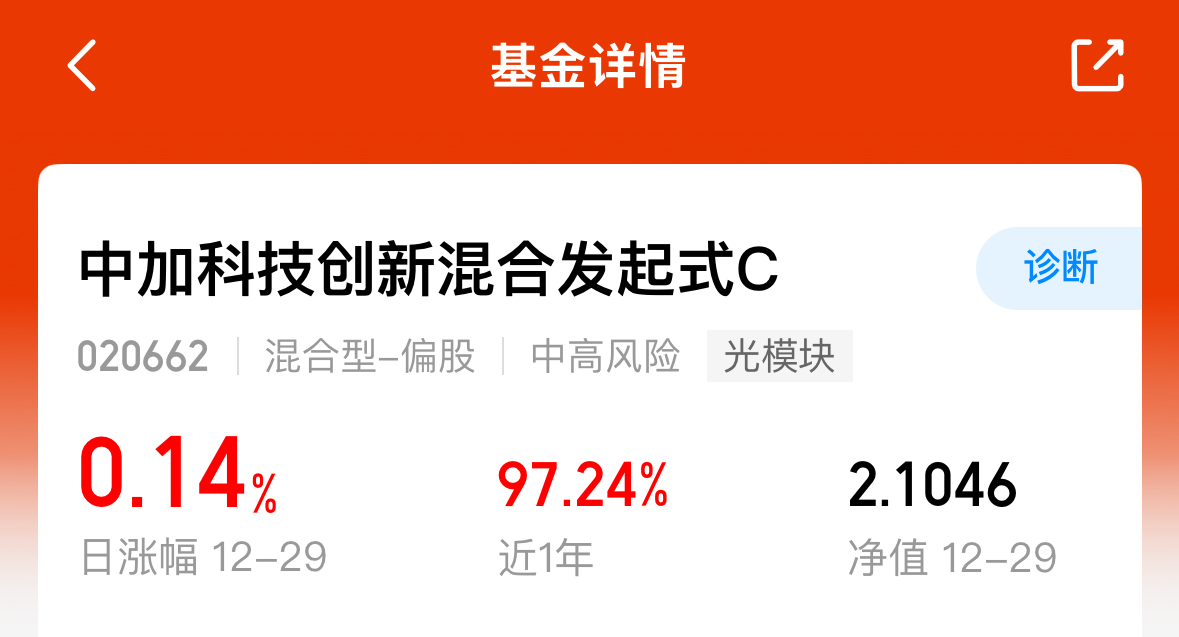 中加科技创新混合C近6月涨了82.39%,还在上周四创了新高,强是真的强。产品最新披露的重仓股主投AI算力,以光模块为主,CPO三巨头“易中天”均在前十重仓之列;此外还辅以AI应用,贴合当前AI算力周期主线,锐度高,弹性自然也不差。我今天加了一份中加科技创新混合C,期待强者恒强的开年行情。