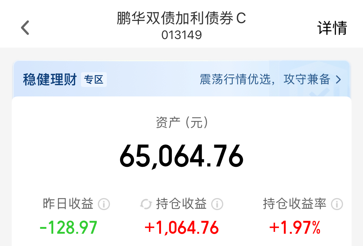节前就这两个交易日了,我看有不少观点让投债买逆回购,这样在假期里也可以“捡钱”。咩咩今天也跟风买了1万鹏华双债加利债券C,这只是我持仓中最满意的固收+,今年涨了18.1%,年内最大回撤4.09%,产品兼具进攻性和稳定性,我个人都投了5万+,也赚了1000+的收益。