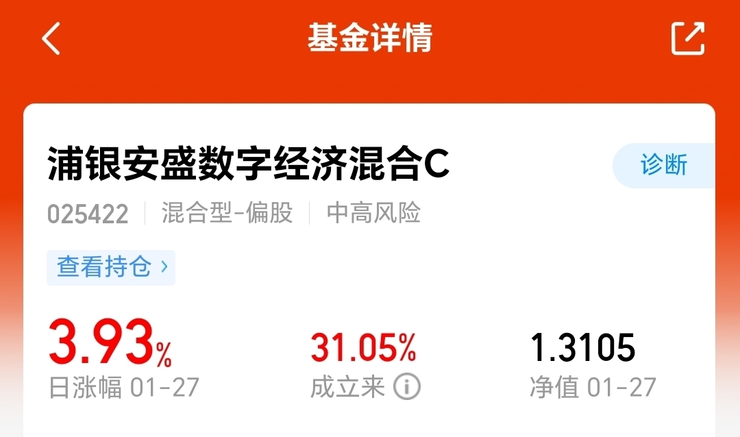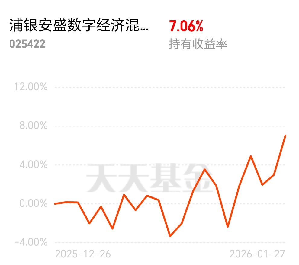 今天CPO板块开盘后持续拉升,到收盘收了实体阳线,可见主力做多的意愿还是非常强烈的。我持有的$浦银安盛数字经济混合C$ 今晚更新后很惊喜,今天大涨了3.93%,成立以来涨了31%了,我也盈利了7%了,看来这个基金还是比较有锐度的,今天跑赢了不少老牌CPO基金。