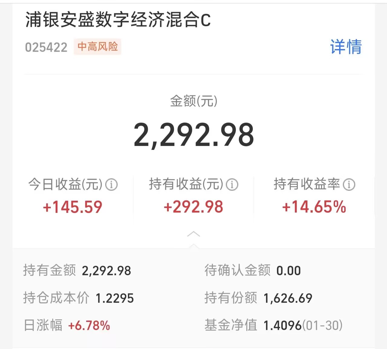今天大盘走势分化明显,最终上证指数大跌0.96%,创业板则是上涨1.27%,板块方面,CPO明显领涨,天孚通信、环旭电子涨幅10%,中际旭创涨幅5.7%,新易盛涨幅6.7%,净值已经更新,$浦银安盛数字经济混合C(OTCFUND|025422)$聚焦CPO个股,今天净值涨幅6.78%,这个又带给我一些惊喜。