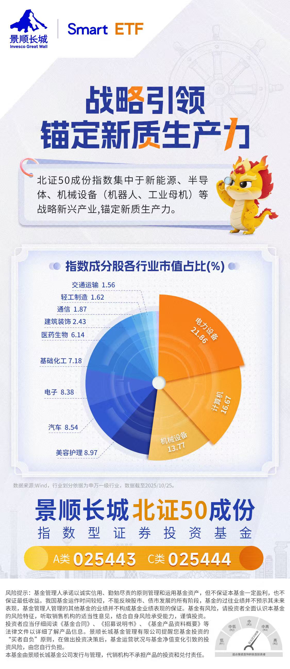 北证50成份指数集中于新能源、半导体、机械设备(机器人、工业母机)等战略新兴产业,锚定新质生产力。景顺长城北证50成份指数A类0254443、C类025444新基,11月17日开募,欢迎关注!