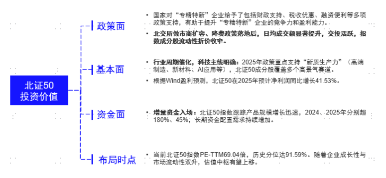 行业周期催化,科技主线明确:2025年政策重点支持“新质生产力”(高端制造、新材料、AI应用等),北证50成分股覆盖多个高景气赛道。