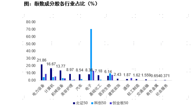 北证50在新能源、计算机、机械设备等多行业均有布局;创业50更侧重新能源、通信、半导体;科创50更偏重的半导体。