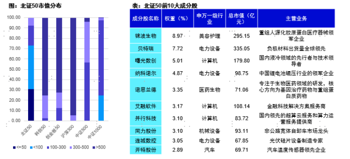 北证50 70%以上成分股市值小于100亿元,多为细分领域“小巨人”。