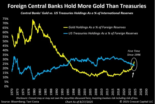 更关键的一个历史性时刻已经到来,全球央行持有的黄金总市值约4万亿美元,这是1996年以来首次超过它们持有的美国国债规模(约3.9万亿美元)。