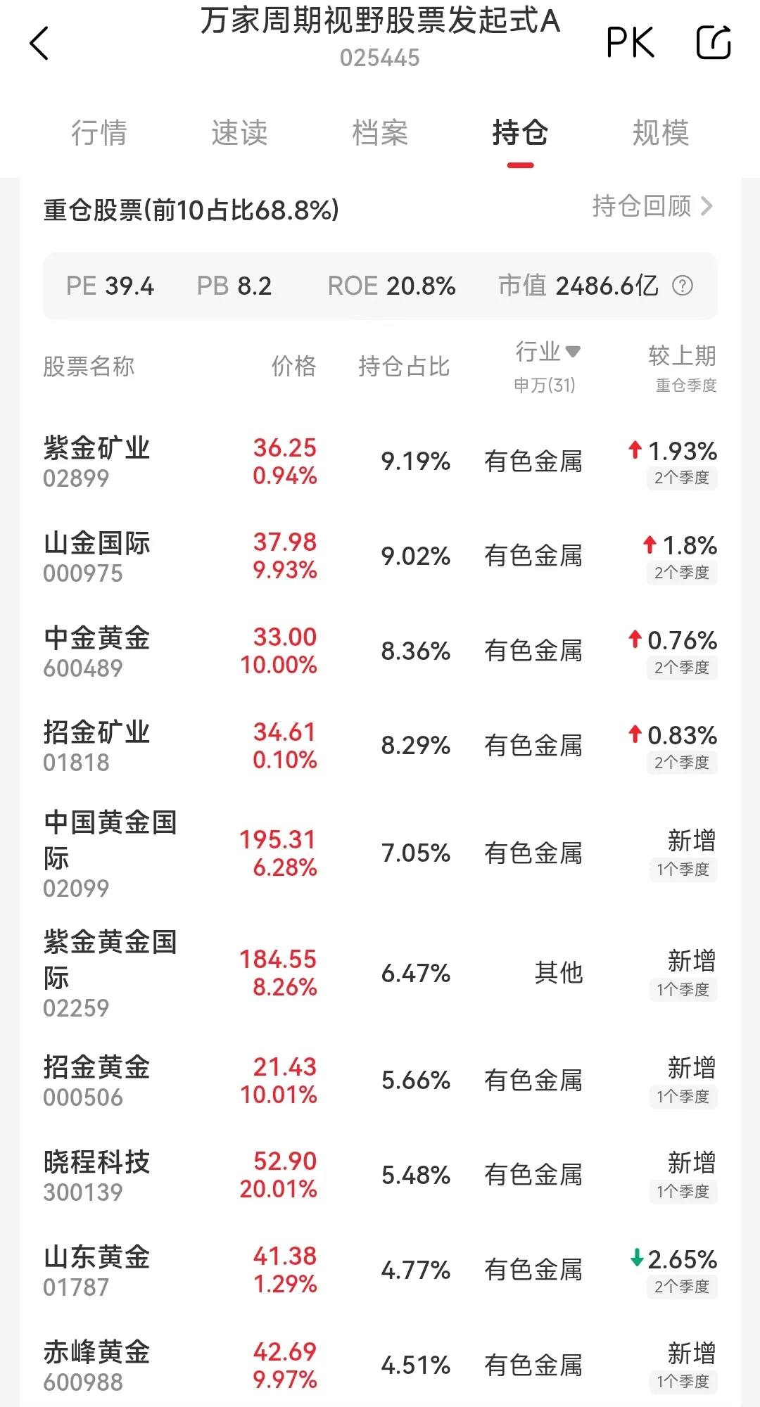 而万家周期视野(025445)竟然在四季度就已经重仓持有5.48%,跻身前十大重仓股。
