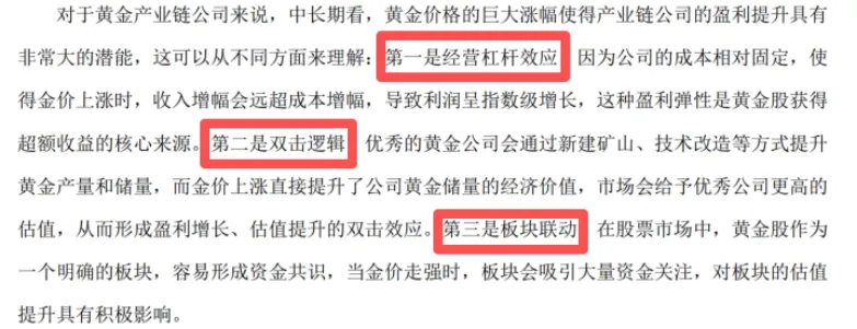 在三季报中,李自龙还把黄金股的投资逻辑讲得特别到位——