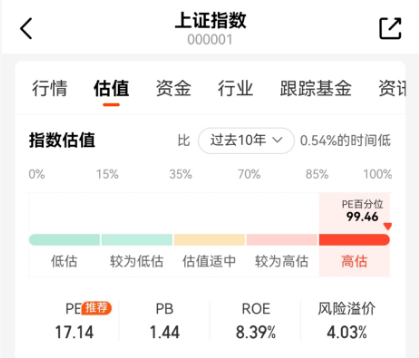 如果仅从上证指数的历史估值百分位,已经严重高估了。但综合的PE为17.14,PE的倒数就是投资收益率(假设企业的经营效益基本持平,无增长也无衰退),1/17.14=5.83%,用ROE除以PB,计算出来的也是投资收益率:8.39/1.44=5.83。