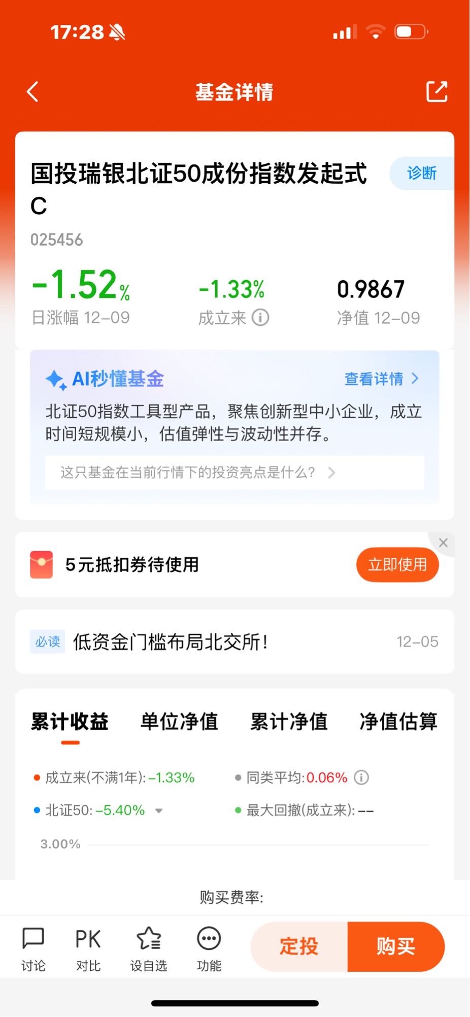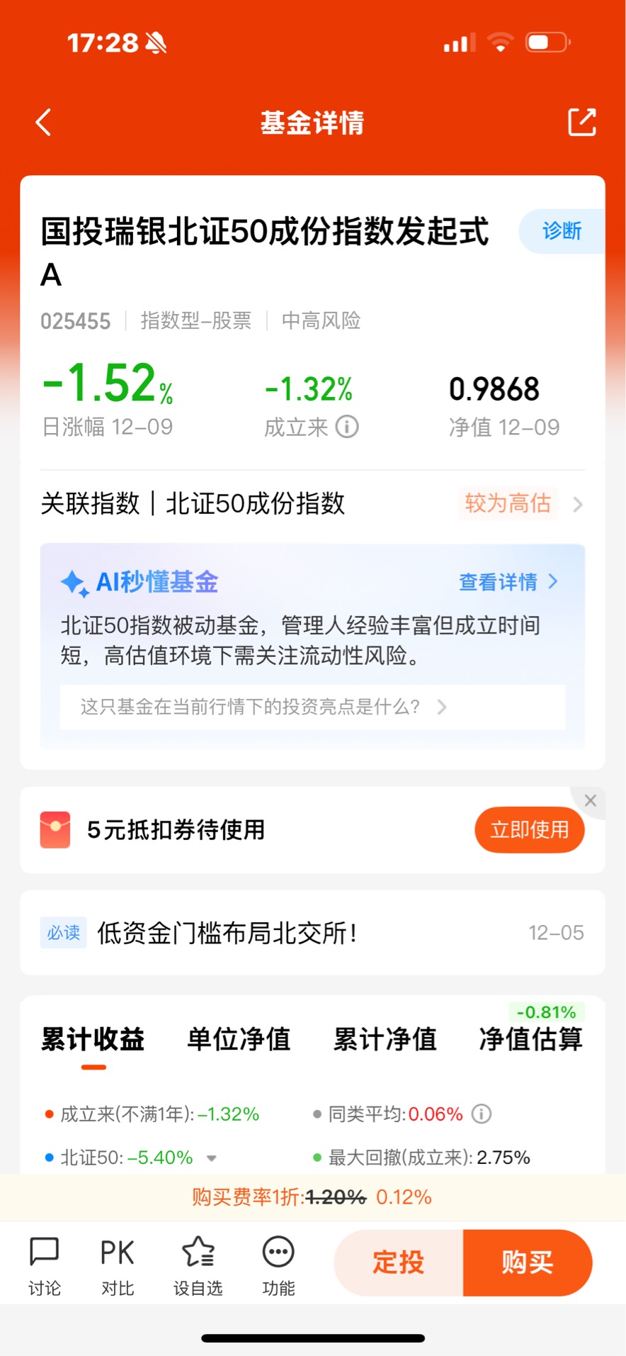 北证50指数基金参与门槛更低的原因:直接投资北交所股票需满足50万元资产和2年投资经验的准入门槛,而国投瑞银北证50成份指数发起式A最低申购仅10元,定投门槛也为10元,部分同类北证50指数基金甚至1元起投。普通投资者无需达到北交所个股投资的高额资产要求,就能借助基金间接持有50只优质成分股,大幅降低了参与北交所投资的资金与资质门槛。