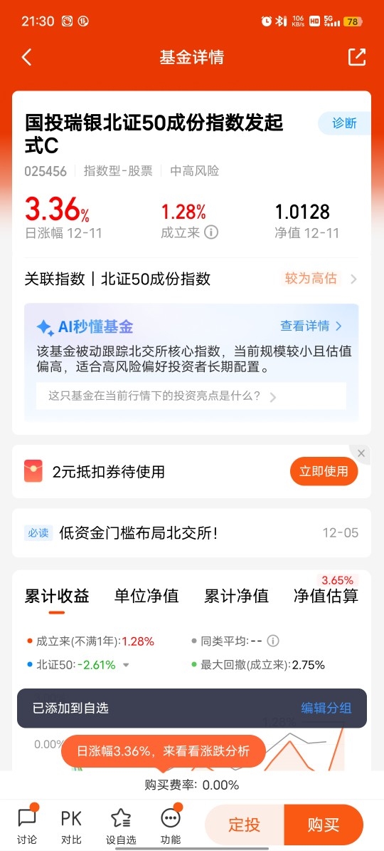 资金门槛方面:直接投资北交所股票,投资者需满足“开通权限前20个交易日证券账户及资金账户资产日均≥50万元+2年以上证券交易经验”,还需通过80分以上的知识测评,这对普通投资者形成了资金和经验的双重限制;而北证50指数基金无最低资金要求,多数产品1元即可起购,也无需满足交易经验和知识测评条件,普通投资者可轻松参与。