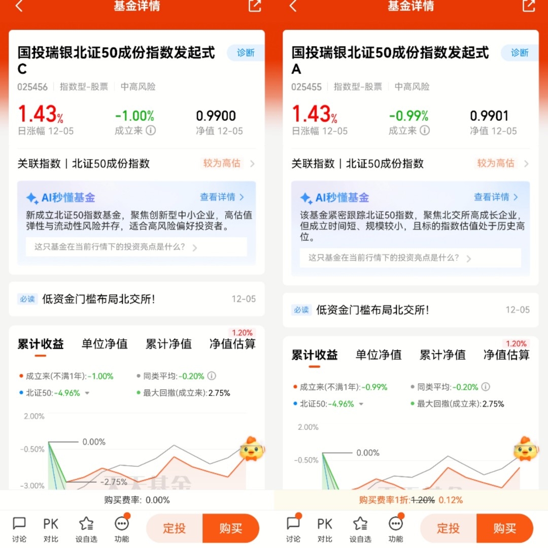 相比直接投资北交所股票需满足50万元日均资产+2年投资经验的高门槛,国投瑞银北证50指数C类份额彻底打破了参与壁垒——最低1元即可起投,无需大额资金储备,也无需满足复杂的投资经验要求,让每一位看好硬科技赛道的投资者都能轻松布局。同时,C类份额无申购费,持有期限较短时赎回成本更低,更适合灵活调整仓位、把握短期行情,或长期定投分摊成本,兼顾了便捷性与性价比。