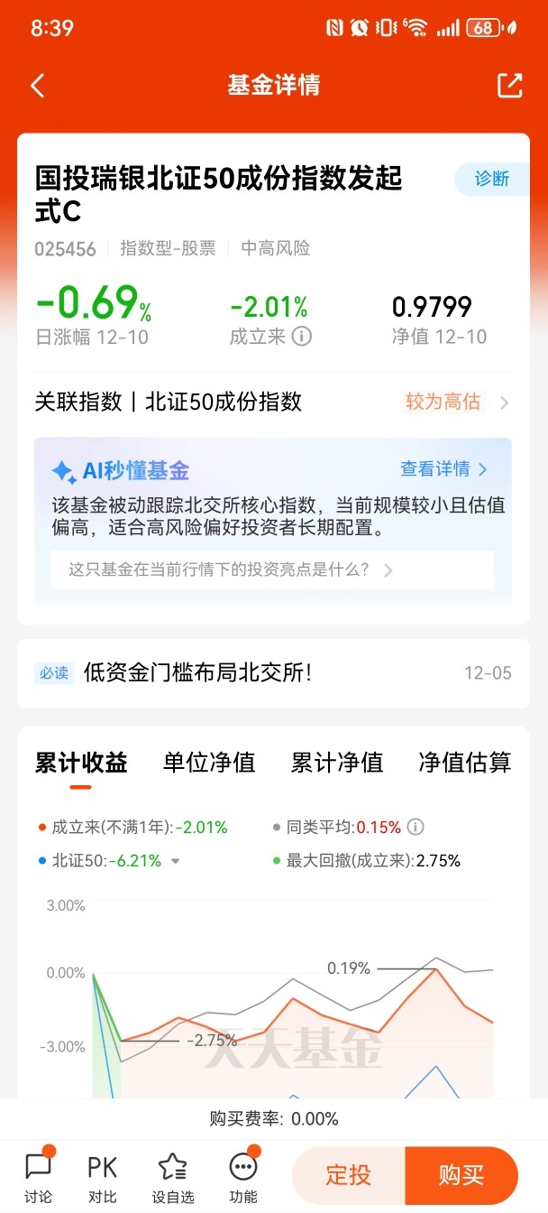 2. 直接投资北交所股票需满足前20个交易日日均资产≥50万元+2年交易经验的门槛,而北证50指数基金(如国投瑞银该产品)10元起投,无资产和经验要求,普通投资者可轻松参与。
