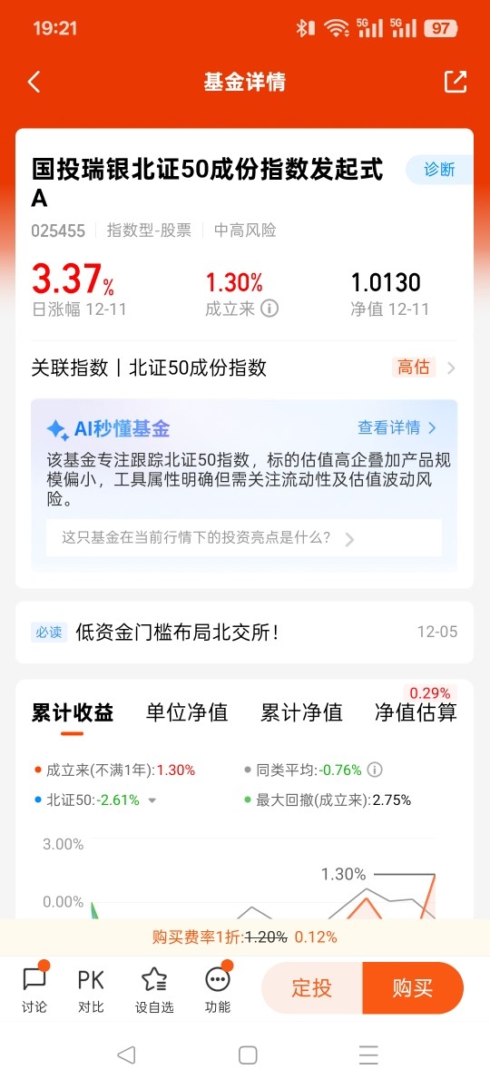 直接投资北交所股票的门槛对普通投资者并不友好,不仅要求申请开通交易权限前 20 个交易日账户资产日均不低于 50 万元,还需满足 2 年以上证券交易经验,同时要通过相关知识测评,这就把不少资金量有限或投资经验不足的投资者挡在了门外。而北证 50 指数基金完全打破了这些限制,多数产品 1 元即可起投,像国投瑞银北证 50 成份指数型发起式基金这类产品,无需满足资产、经验等硬性要求,也不用单独开通北交所权限,普通投资者通过基金账户就能间接参与北证 50 成分股的投资,相当于用小额资金撬动了北交所的投资机会,大幅降低了参与门槛。