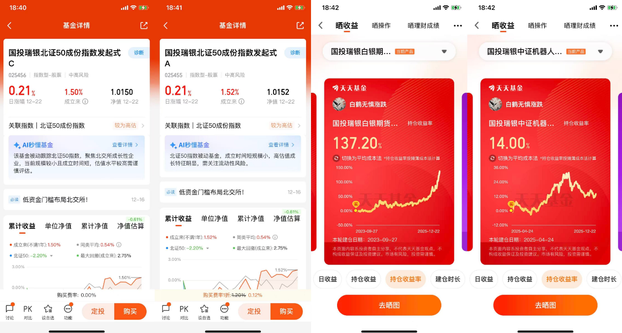 更关键的是,国投瑞银在指数基金领域布局很深,属于“专业玩家”。公司量化投资团队一半以上都是博士,学术底蕴扎实,而且构建了完善的指数产品体系,从沪深300这样的宽基,到科创板、机器人这样的成长赛道,再到北证50这样的特色指数,全覆盖。对咱们投资这只北证50基金来说,公司的实力直接影响指数跟踪的精准度和风控能力——北证50波动大(单日30%涨跌幅),需要强大的投研团队支撑才能控制跟踪误差,国投瑞银的量化实力正好能匹配这个需求,让咱们投资更有保障。