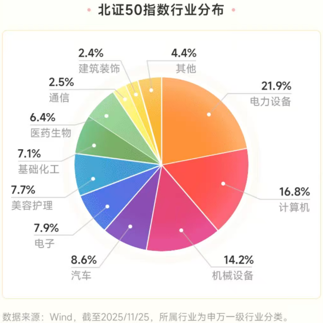 北证50指数精准覆盖了多个新兴战略产业,形成了以科技创新为核心的产业布局,具体包括新能源(涵盖光伏、风电、储能、新能源汽车产业链等细分领域)、半导体(包含芯片设计、制造、封装测试、半导体材料与设备等全产业链环节)、机器人(涉及工业机器人、服务机器人、特种机器人及核心零部件等)、创新药(涵盖生物药、小分子创新药、临床CRO/CDMO等医药创新产业链)等关键领域。