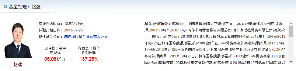 从履历来看,赵建经理的靠谱度还是很在线的!首先学历背景扎实,是同济大学管理学博士,对量化投资、指数跟踪这类需要专业分析能力的领域来说,高学历背景能提供更强的研究支撑。其次从业经验超丰富,2010年就加入了国投瑞银,至今在公司待了15年以上,属于“老将”级别的基金经理,稳定性拉满。