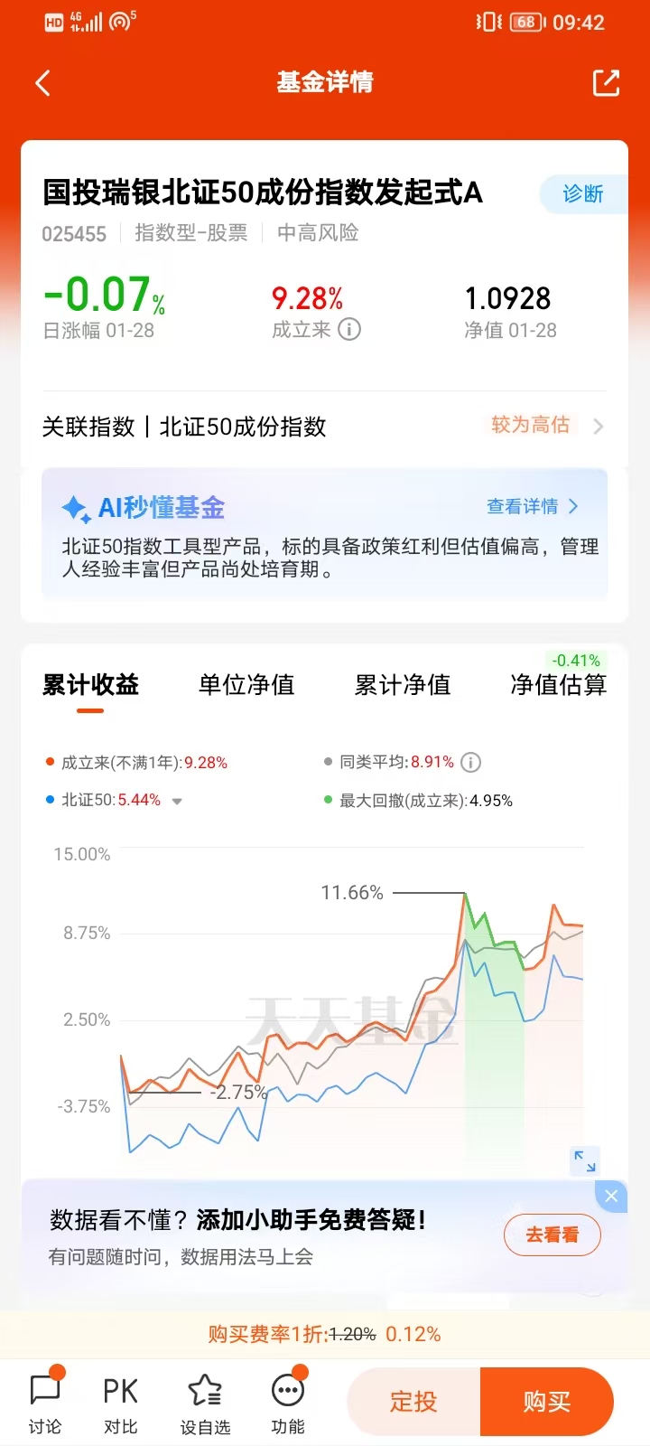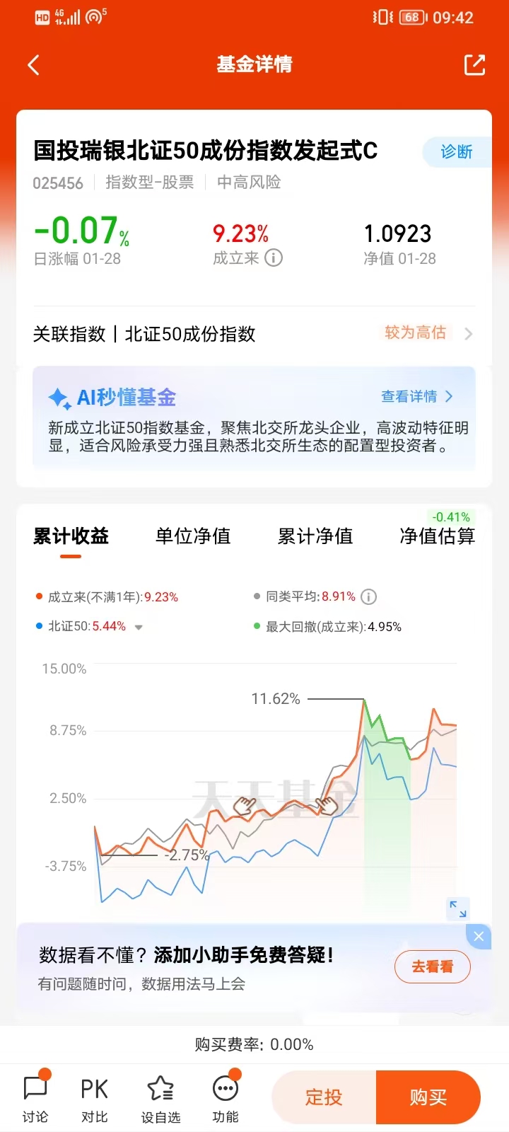 直接投资北交所股票需满足"50万元日均资产+2年交易经验"的高门槛条件,将大量普通投资者挡在门外。而北证50指数基金如国投瑞银北证50成份指数发起式C,10元即可起投,无资产和经验要求,普通投资者几百元就能一键布局北交所50只核心标的。