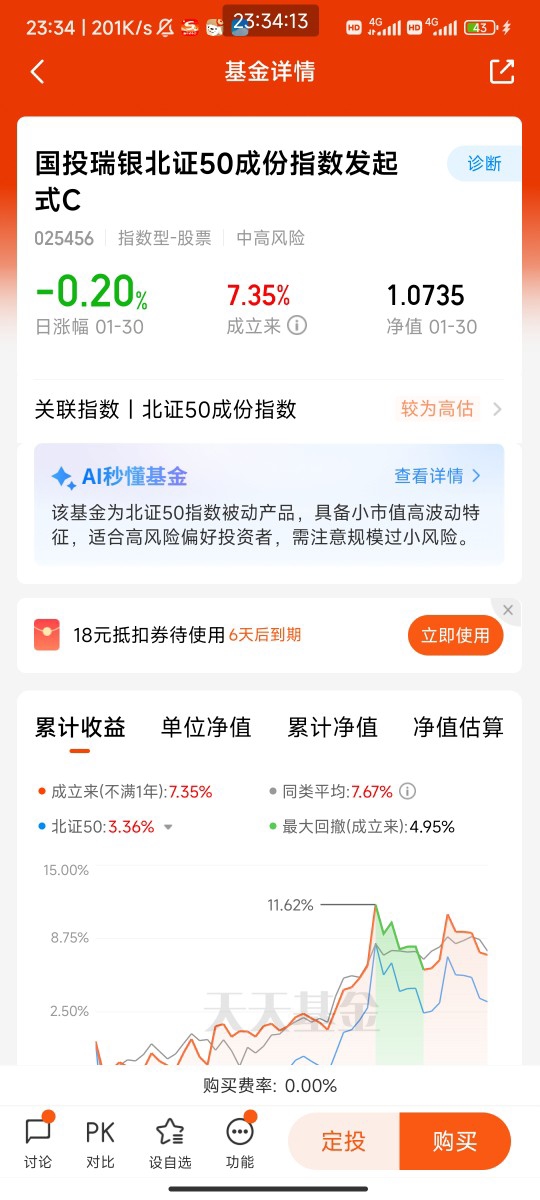 这一点真的戳中了普通投资者的痛点。直接买北交所股票,有两个硬门槛:一是账户里得有50万资产,二是得有2年以上投资经验,这把很多散户挡在了门外。但北证50指数基金完全没有这些限制,像国投瑞银这只基金,1元就能起投,几百块钱就能参与,相当于“零门槛”。而且直接买北交所股票,还得自己研究个股、盯盘,不小心就会踩雷;指数基金一次性打包了50只成分股,不用自己选股,基金经理会帮着跟踪指数,省心又降低了风险,对咱们普通投资者来说,门槛和难度都大大降低了。