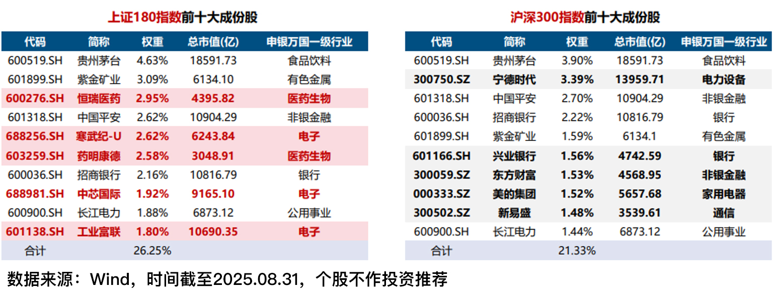 从前十大成分股来看,上证180指数共覆盖八个行业的核心龙头,行业分布相对分散,对食品饮料、医药生物、非银金融、电子等国家核心资产及新兴科技产业均有所跟踪,超配了医药生物行业龙头恒瑞医药、药明康德,捕捉医药创新出海的产业机遇;超配了电子行业龙头寒武纪、中芯国际、工业富联,跟踪国产半导体设计及制造业领导者的政策机遇。