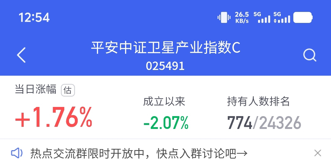 今日市场气氛火热,早盘开盘一片飘红各大指数持续上涨!当今市场板块化明显,我们选择的方向一点要正确!现在科技发展迅速,尽量选择和科技相关的$平安中证卫星产业指数C$ 今日估值上涨1.76%,太牛啦!
