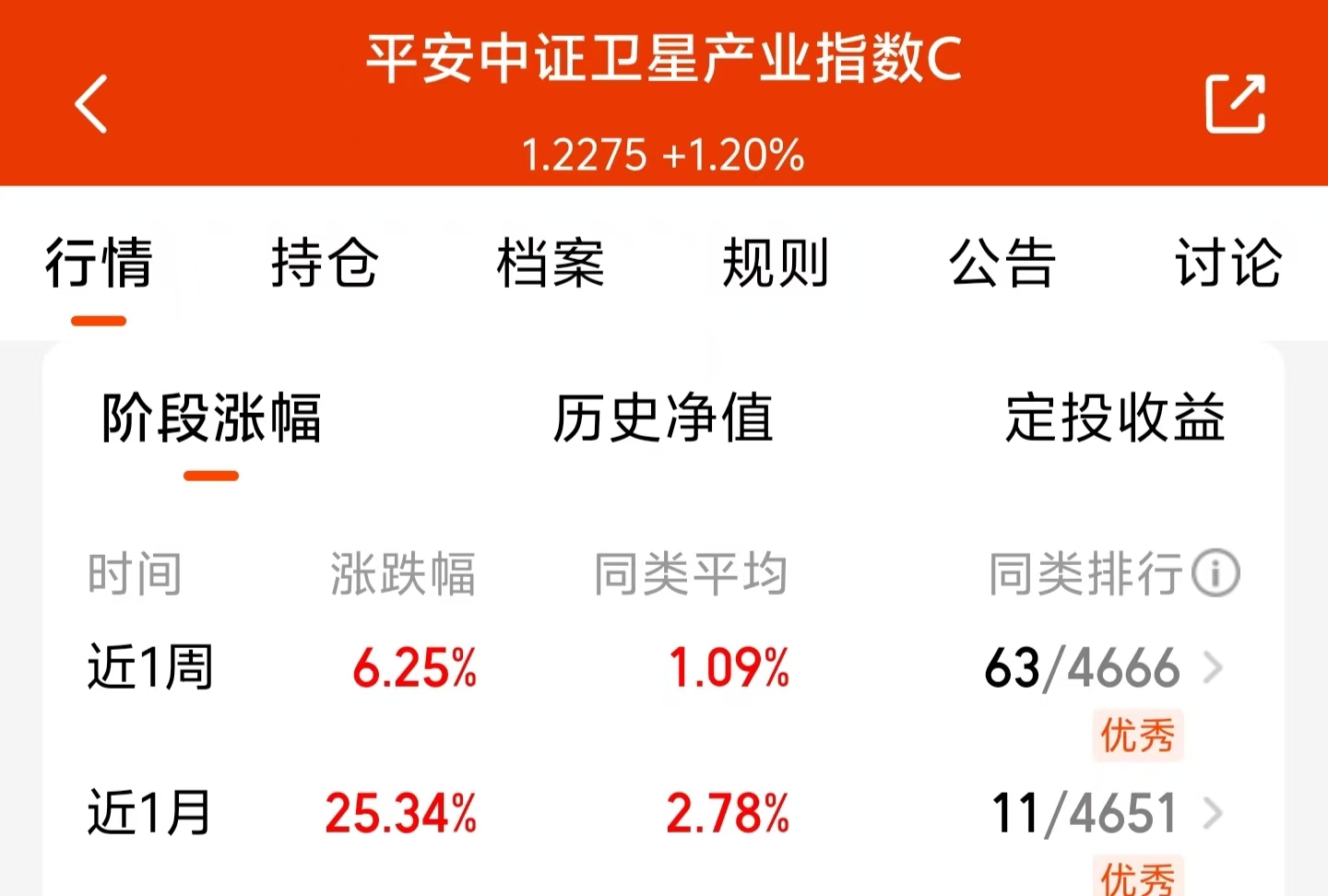 近期如火如荼的莫过于商业航天板块了,咱们$平安中证卫星产业指数C$ $平安中证卫星产业指数C$ 表现也不错,昨日大涨1.20%,从24号到29号连涨4天,近一个月都涨超25%了,表现亮眼,商业航天的行情还没走完,短期波动很正常,耐心等待