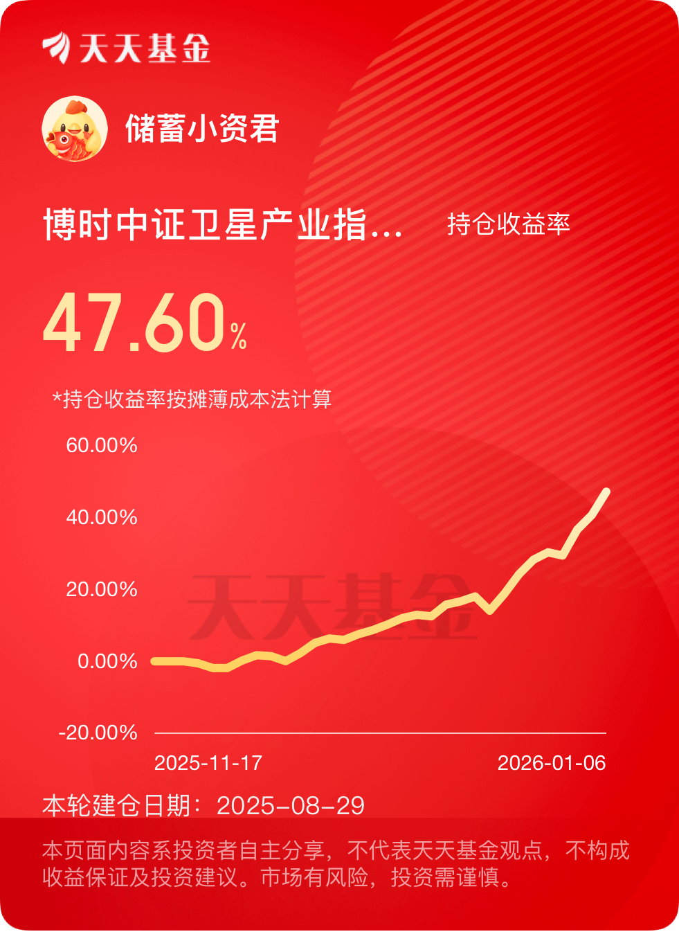 最近一直在深度研究2026年的投资赛道,翻遍了行业研报、政策解读,还对比了不少赛道基金的近期表现,最后发现卫星产业真的是被低估的潜力股!就拿手里的$博时中证卫星产业指数C$ 来说,这只基的涨幅数据直接惊艳到我了,近一周涨幅高达13.71%,而同类基金平均涨幅才3.37%,足足甩开了10个百分点还多,更别提近一个月40.02%的亮眼涨幅,在同类产品里直接名列前茅。现在回看整个卫星产业的大环境,政策利好密集出台,不管是低轨卫星星座的建设,还是卫星应用场景的商业化落地,推进速度都在明显加快。而且这个赛道属于国家重点扶持的高端制造领域,技术壁垒高、市场需求大,比起那些已经炒到高位的热门赛道,卫星产业现在正处在上升期的黄金阶段,不管是长期布局还是短期抓收益,都有很大的操作空间。真心觉得,2026年想选对投资赛道,卫星领域绝对值得重点蹲守!##存储概念迎烈火烹油!英伟达新方案引爆# #新年观察局:2026我看好的投资赛道#