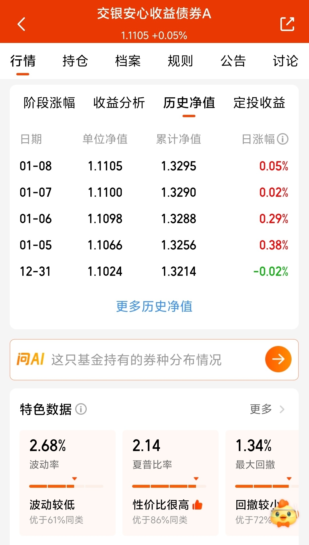 交银安心收益债券A的净值走势与债券板块联动性较强,近期在市场波动中仍保持小幅上行的整体趋势,体现出债券板块的防御优势。债券板块与权益市场关联性较低,能有效分散配置风险,基金的低波动率和小回撤数据,也印证了布局该板块在资产组合中的平衡价值。