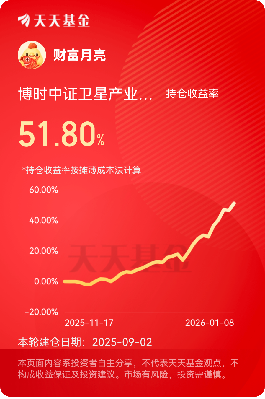 刷到2026年要成商业航天火箭发射大年的新闻,我心里直接乐开花,幸好早就拿着$博时中证卫星产业指数C$ 了!之前踩过不少主题基的坑,要么挂羊头卖狗肉,持仓跟赛道八竿子打不着,要么涨得慢跌得快,拿在手里闹心。这只基不一样,从入手开始就紧紧跟着卫星产业链的节奏走,不管是火箭制造环节的技术突破,还是卫星组网的政策利好,它都能稳稳跟上。现在国家对商业航天的支持力度越来越大,从顶层规划到地方配套政策一波接一波,发射任务肯定会越来越密集,上下游的公司业绩肯定会跟着兑现。我当初就是看中这个赛道的长期潜力才果断入手,现在越拿越有底气,完全没打算减仓,就等着后续更多发射任务落地,继续跟着吃肉!#商业航天持续火爆:2026或迎火箭发射大年# #晒收益#