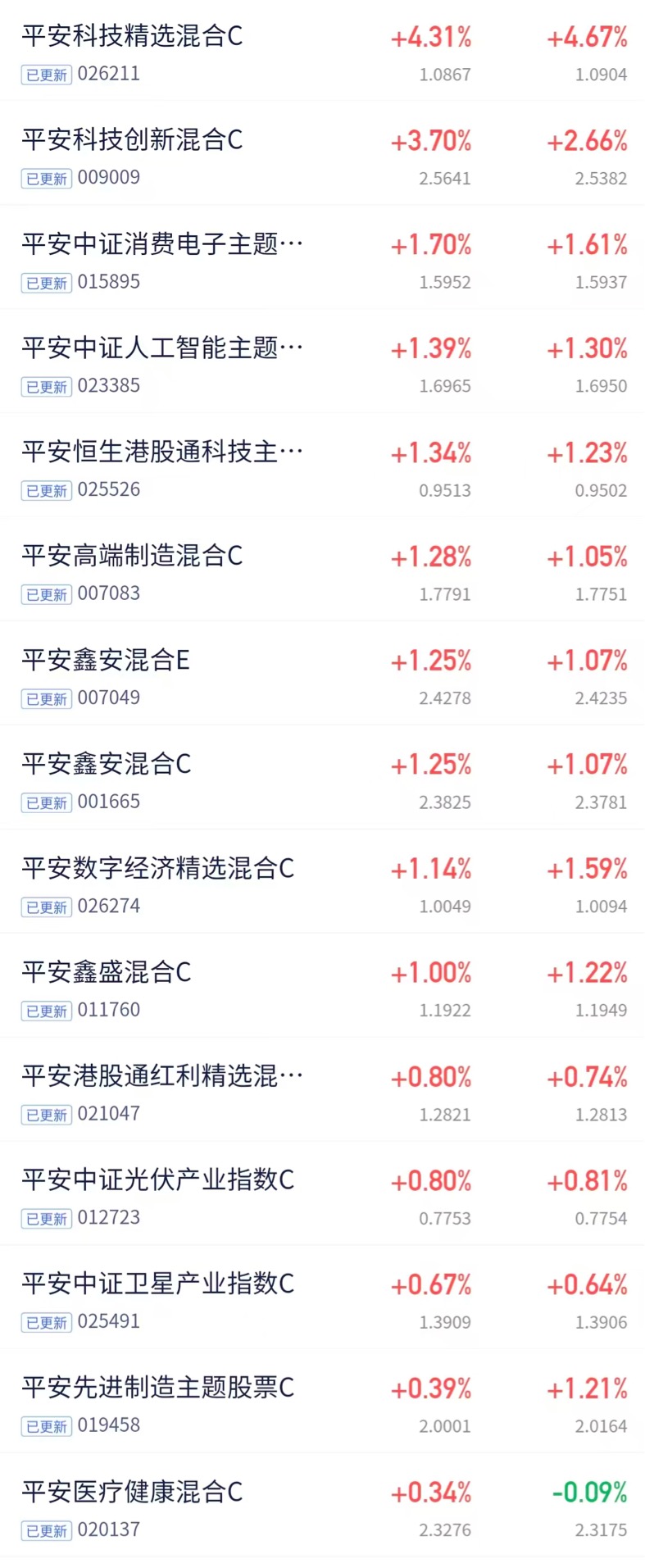 今天市场走高还挺意外的,还好科技依然坚挺,来看看今天平安家族更新后的情况吧,整体都不错,红红的一片呢,$平安科技精选混合发起式C$ +4.31%这只主投cpo,产业趋势确定性高,$平安科技创新混合C$ +3.7%,$平安中证卫星产业指数C$ 0.67%找机会再加一些,看好后期市场