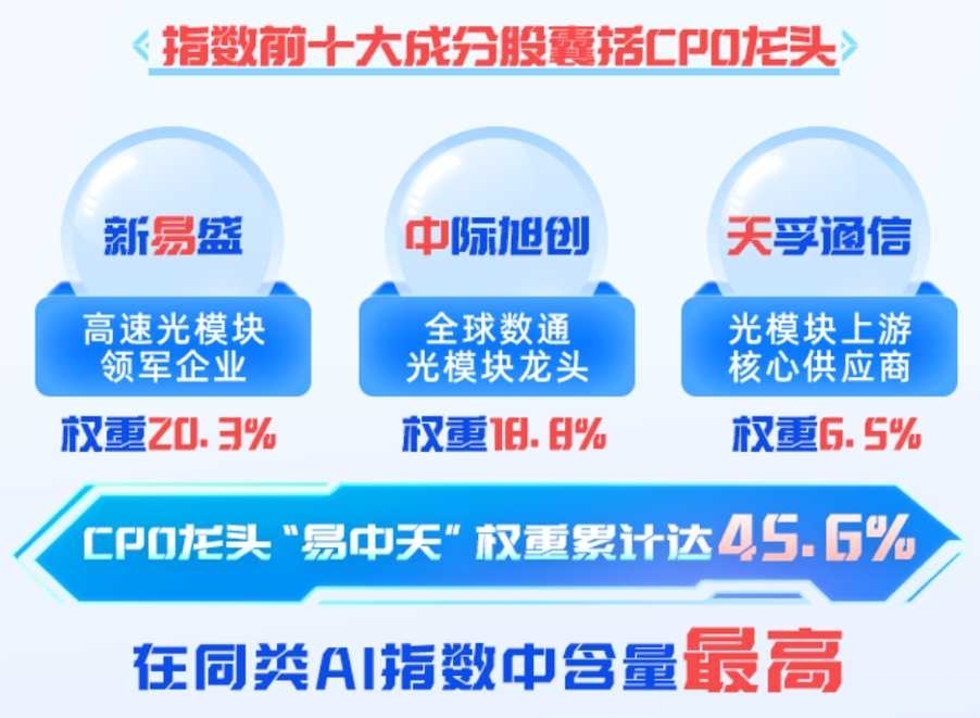 其次,“易中天”CPO光模块龙头的高占比是关键加分项。看了Wind数据才知道,指数前十大成分股中,新易盛、中际旭创、天孚通信这几家CPO龙头权重累计达45.6%,在5只同类AI指数里排名第一。要知道我国光模块技术全球领先,是AI基础设施建设的“刚需环节”,全球科技巨头的算力竞赛,必然会带动这类龙头企业业绩增长,高权重配置相当于抓住了AI硬件赛道的核心引擎。