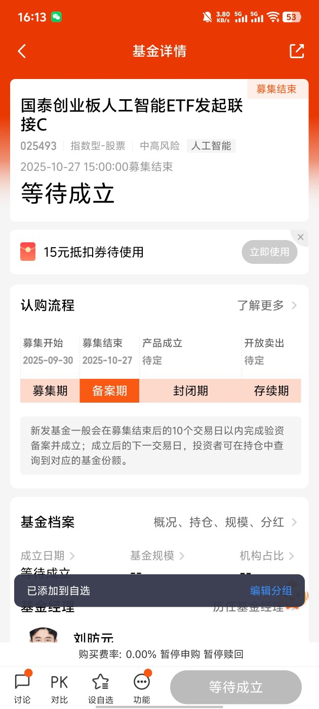 人工智能无疑是未来重要的发展方向,但要把握节奏。不妨选择在市场调整时分批买入$国泰创业板人工智能ETF发起联接A$ ,重点关注有实际业绩支撑的算力产业链。