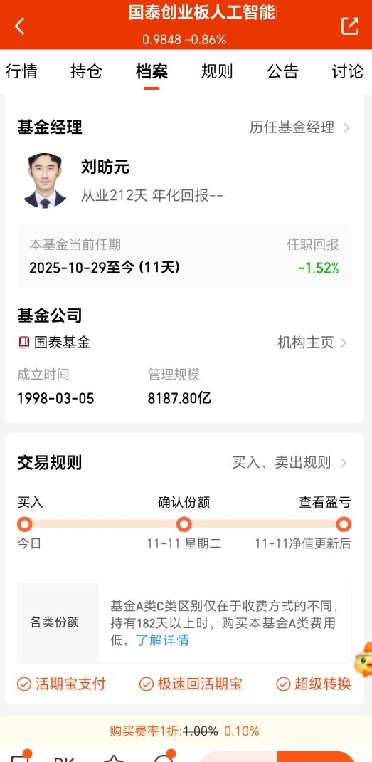 国泰创业板人工智能ETF发起联接A为场外基金,投资者可以通过银行、基金公司官网、第三方基金销售平台等渠道进行申赎,无需开通股票账户,操作便捷。同时,基金的起投金额较低(通常为10元起投),适合普通投资者进行小额投资和定投。
