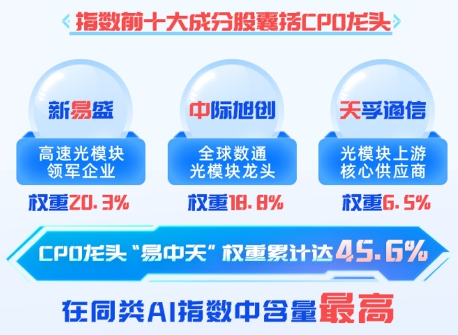 作为AI算力互联的核心环节,CPO板块是创业板人工智能指数的第一大权重板块,也是指数的核心竞争力所在。指数前十大成分股中,“易中天”(中际旭创、新易盛、天孚通信)等CPO光模块龙头权重合计达45.6%,在同类AI指数中含量最高,充分享受CPO赛道的高增长红利。