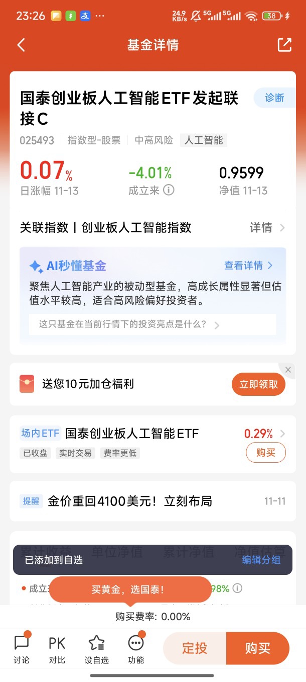 #人工智能怎么投# #黄金又牛起来了!这次你上车了吗?# #科技热点摊开业啦# $国泰创业板人工智能ETF发起联接A$
