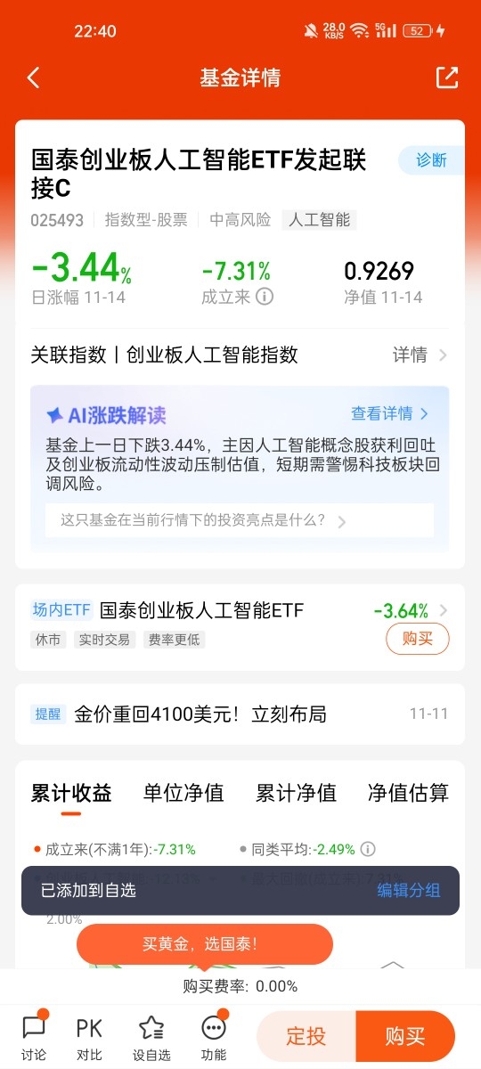 在投资思路上,我倾向于通过ETF这种工具来参与人工智能行情。与直接投资个股相比,AI板块的选股难度较高,业绩波动大、炒作情绪浓,而ETF提供了更好的赛道暴露度与分散化风险对冲机制。国泰创业板人工智能ETF联接A基金跟踪的是创业板人工智能指数,该指数聚焦度高,成分股涵盖了AI大模型、算法训练、数据标注、语音识别、智能芯片等主线环节,能够让我高效地捕捉AI主题行情,同时规避个股极端波动的风险。