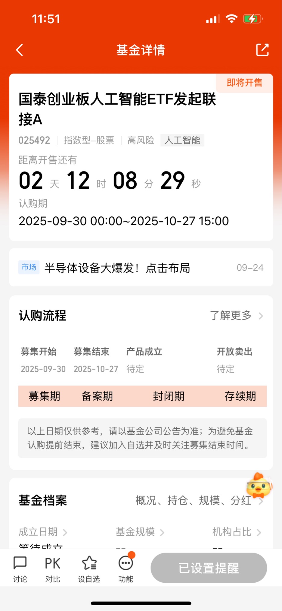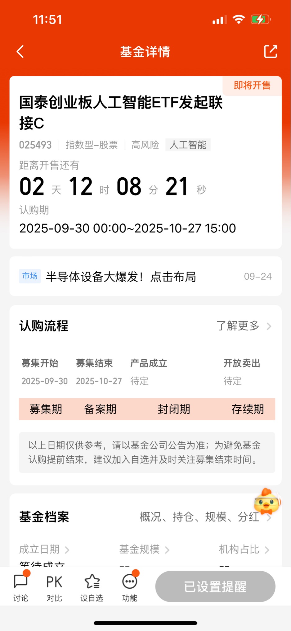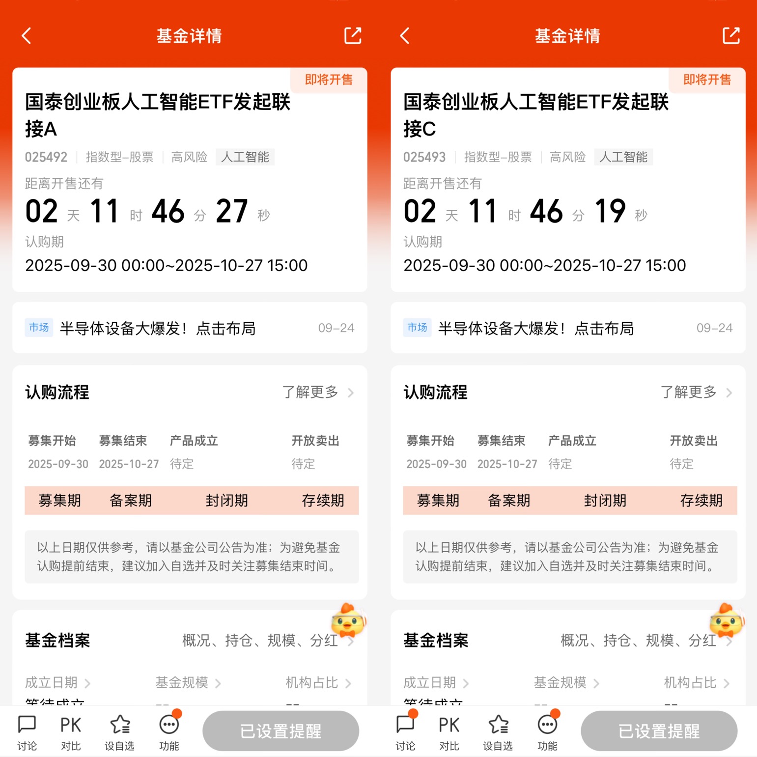 可能有小伙伴说了,你讲的太复杂太专业了,我搞不懂这些,但是我还想分一杯羹,有没有简单易行的办法呢?当然有,我向您推荐公募基金,这是最适合我们普通投资者的办法了,简单易懂,风险又小,操作方便,绝对是理想之选!就比如国泰创业板人工智能ETF发起联接基金,就是你值得重点关注的宝藏基金。不信?那我就给各位宝子们详细介绍一下,我相信,通过我的介绍,你一定会爱上这款宝藏基金!这是一款刚登场的“智能选手”——国泰创业板人工智能ETF联接基金(A类:025492,C类:025493)。这只基金在9月30日正式发行,对于那些想在场外布局人工智能赛道的朋友来说,简直是及时雨一般的存在。接下来,咱们就从八个维度,把这只基金好好“扒一扒”,让你明明白白它的魅力所在。