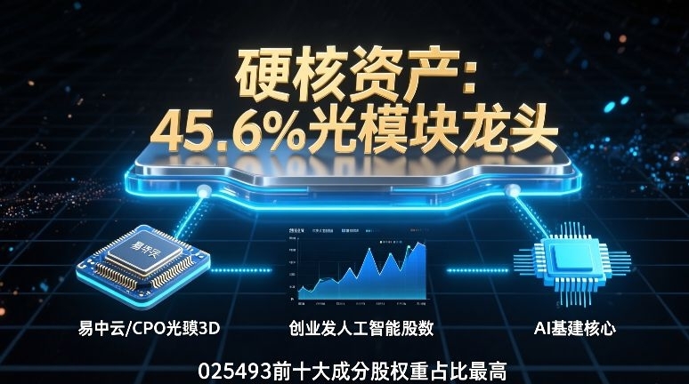 前面说过,光模块是AI基建的“核心”,而这只指数的前十大成分股里,“易中天”(其实是行业内几家龙头的戏称)这类CPO光模块龙头的权重高达45.6%,在所有同类AI指数里是最高的!这意味着什么?相当于你投025493,近一半的钱都在买AI硬件里最核心、最赚钱的公司,不是“蹭AI热度”的杂毛股,而是真真正正的“硬核资产”。