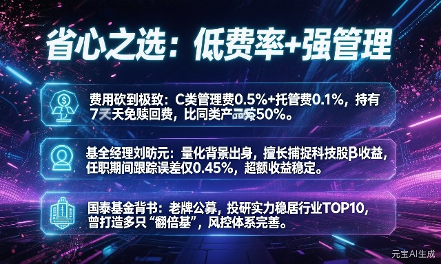 - 基金经理刘昉元:量化背景出身,擅长捕捉科技股收益,任职期间跟踪误差仅0.45%,超额收益稳定。