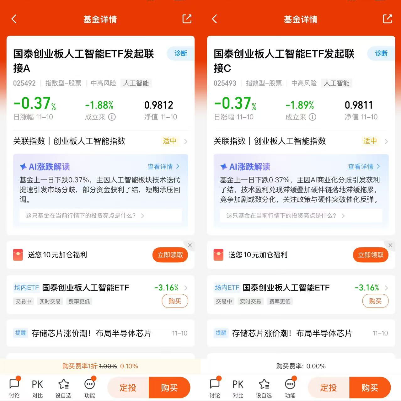国泰创业板人工智能ETF联接基金(A类025492,C类025493)成立于2025年3月26日,跟踪创业板人工智能指数(970070),采用完全复制法构建投资组合,目标是投资于目标ETF的比例不低于基金资产净值的90%。基金业绩比较基准为创业板人工智能指数收益率95%+银行活期存款利率(税后)5%,管理费率0.5%/年,托管费率0.1%/年,C类销售服务费率0.2%/年。