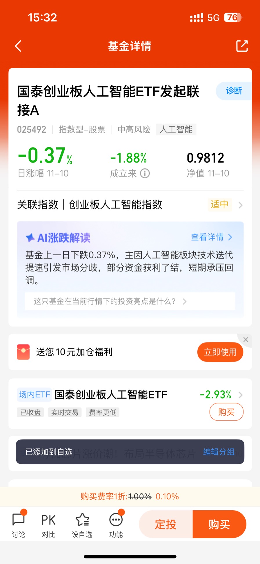 我认为AI行业技术迭代快、成长空间大,但个股波动也大,通过ETF联接基金分散投资,能有效降低单一标的风险。而且创业板的AI企业多聚焦于应用落地端,随着AI+工业、AI+医疗、AI+消费等场景不断渗透,业绩兑现潜力值得期待。从估值来看,经历前期调整后,当前创业板AI板块估值已处于相对合理区间,正是布局性价比不错的阶段。