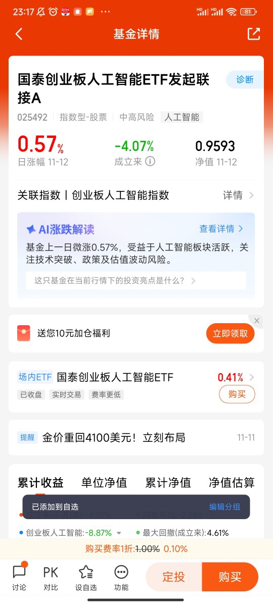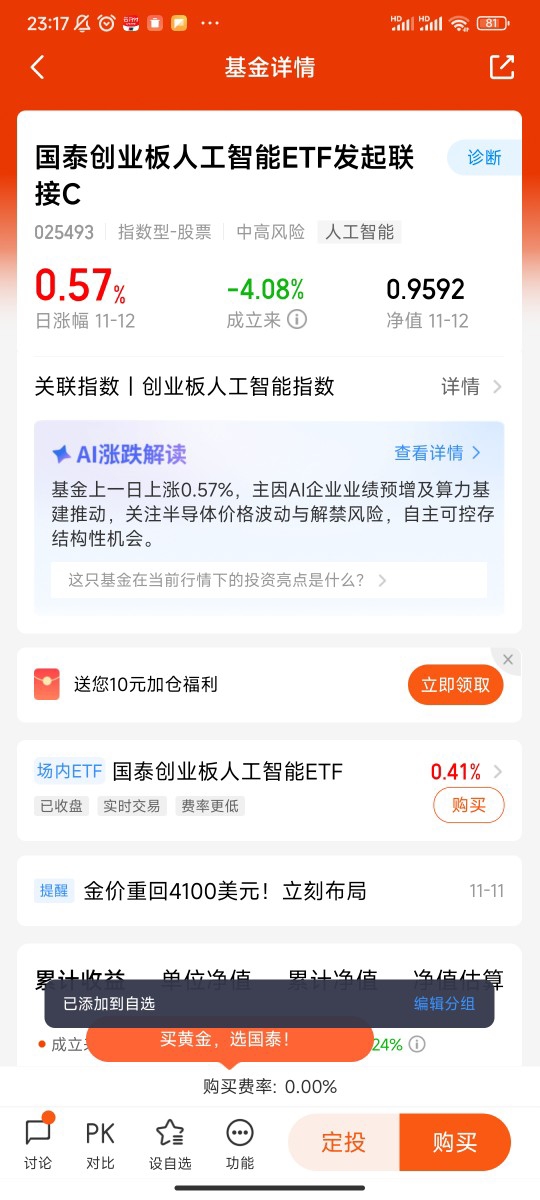 当然,科技板块波动本身较大,AI作为高成长性赛道,短期震荡难以避免,但长期来看,产业趋势不可逆。对于看好AI长期发展、但又担心个股风险的普通投资者来说,国泰创业板人工智能ETF联接C既无需开通股票账户,又能通过专业指数配置分享全链条红利,是兼顾效率与安全性的最优解之一。在产业风口与流动性宽松预期叠加的背景下,不妨以长期视角布局,借道这只基金拥抱AI时代的确定性成长,在科技浪潮中把握属于自己的投资机遇。@国泰基金 @天天精华君 @讨厌的金礼杰4