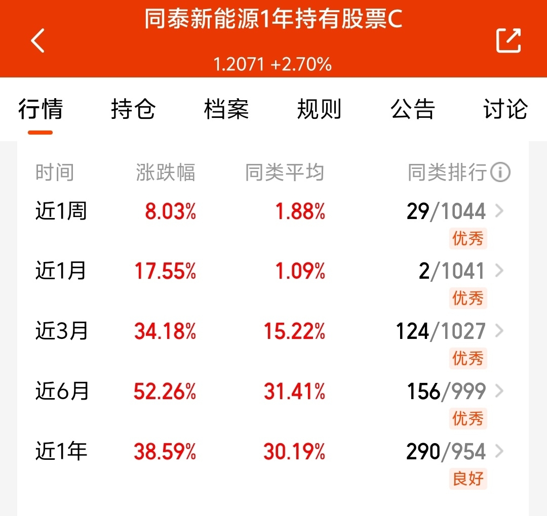 近一月全市场第二!同泰新能源一年期火遍投资圈~昨日权益基金打榜成功,基金经理是中