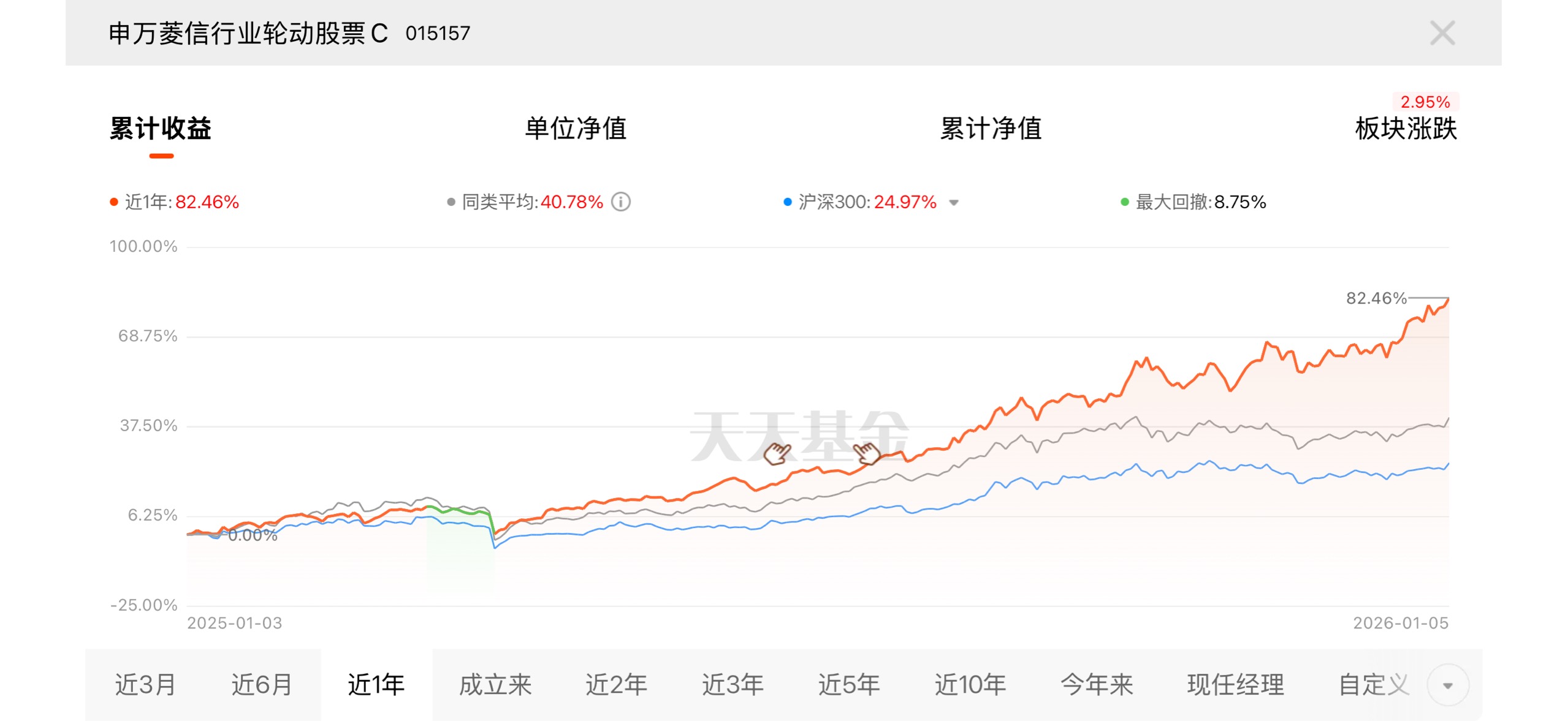 A 股 4100 多股上涨,有色金属领涨全场,近 3 日涨近 8 个点。$申万菱信行业轮动股票C$ 重仓紫金矿业等标的,今日估值涨超 3 点,近 1 年 82.46%,跑赢 97% 同类,靠谱又能打!