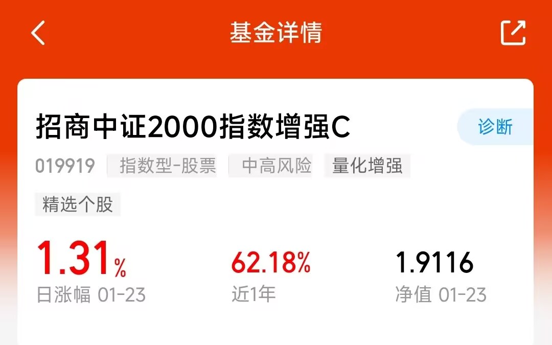 大盘正沿着 5 日均线碎步走强,不过需要注意,目前指数已经逼近 4200 点压力位,这个位置附近很可能出现中阴回调,进而下探 20 日均线的支撑力度。$招商中证2000指数增强C(OTCFUND|019919)$近一年涨幅达到 62.18%,表现亮眼。加之春节前后有微盘日历效应,小微盘往往能有较好表现,当前整体趋势依旧向好。