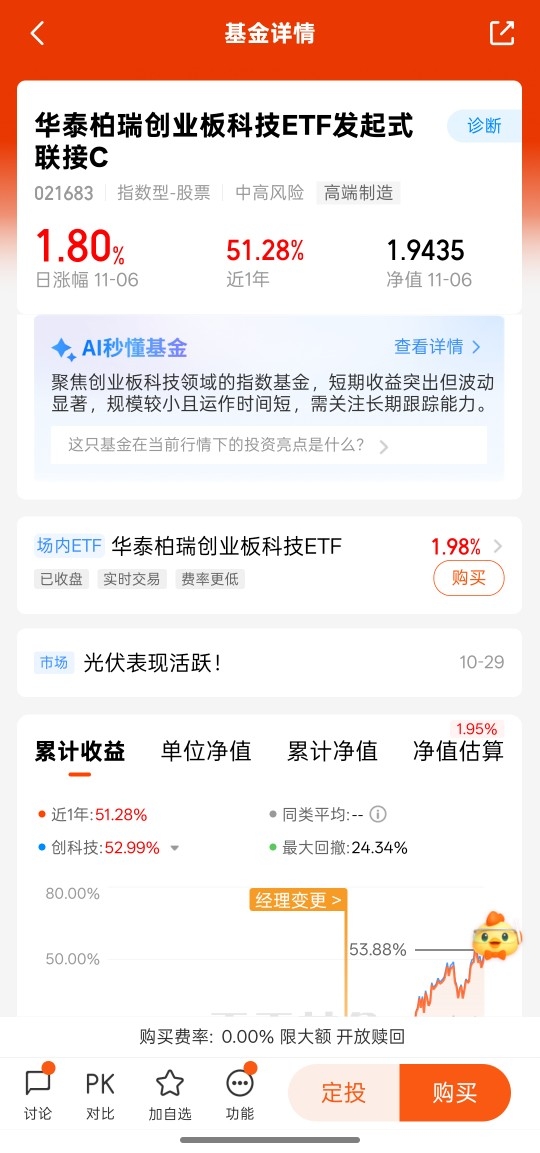 今天创业板指的行情太给力了!稳稳翻红不说,加上近期的政策利好和板块景气度回升,越来越多资金开始关注这个成长赛道。创业板指的核心逻辑就是科技成长,里面的公司要么跟着全球AI算力浪潮赚海外的钱,要么在新能源、医药这些赛道里深耕,都是未来发展的大方向。但对于没时间研究、没专业知识的普通人来说,直接入市风险太高,华泰柏瑞就是最佳选择!它相当于创业板科技赛道的“直通车”,一键布局优质标的,不用自己选股,分散风险更安心。华泰柏瑞是老牌基金公司,运作规范靠谱,C类基金成本低、操作灵活,不用长期锁仓,闲钱随时能投,既能分享科技成长的红利,又能避免个股波动的风险,新手和稳健型投资者都能放心冲~#11月基金投资策略#